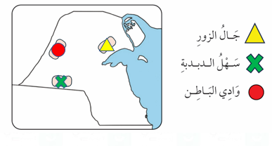 ضع الرمز الدَّال عَلَى الكَلِمَاتِ التالية في مَكانِها الصَّحيحَ عَلَى خريطةِ وَطَنِي الكُوَيْتِ