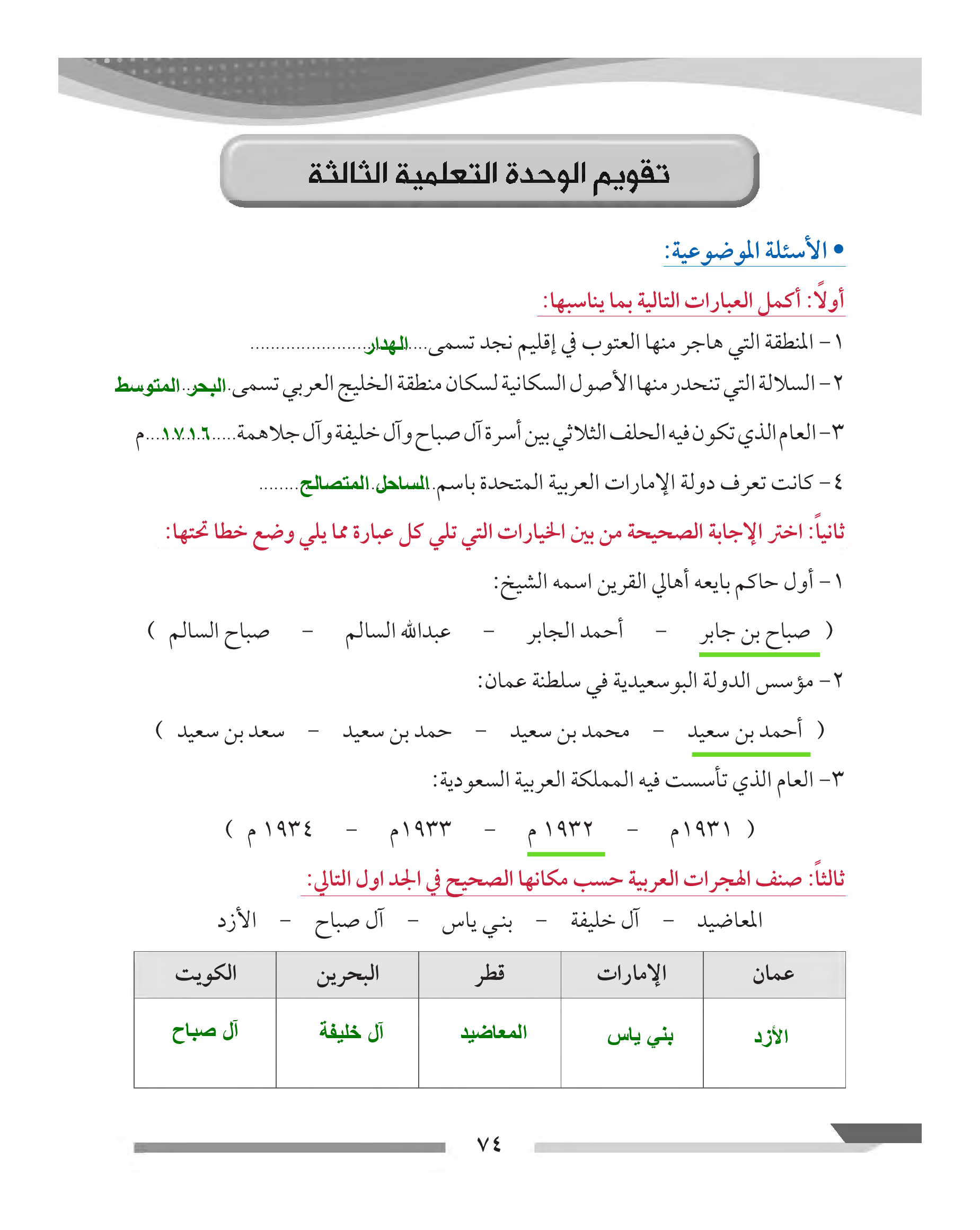تقويم الوحدة الثالثة