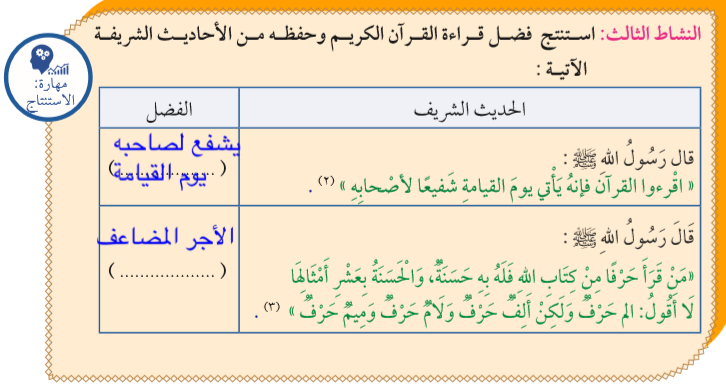 3- أستنتج فضل قراءة القرآن الكريم وحفظه: