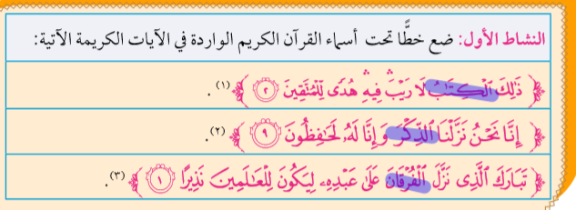 النشاط الأول: ضع خطا تحت أسماء القرآن الكريم الواردة في الآيات الكريمة الآتية: