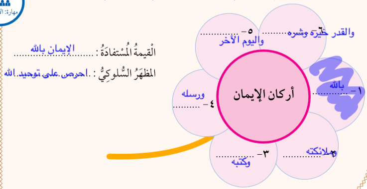 النشاط الثاني: اكتب أركان الإيمان في الشكل الآتي، ولون ركن الإيمان الوارد في آية الكرسي، واسْتَخلص منه القيمة ومظاهرها السُّلوكِيَّة.