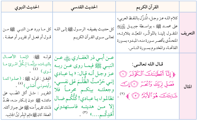 1- أعرف القرآن الكريم والحديث القدسي و الحديث النبوي :