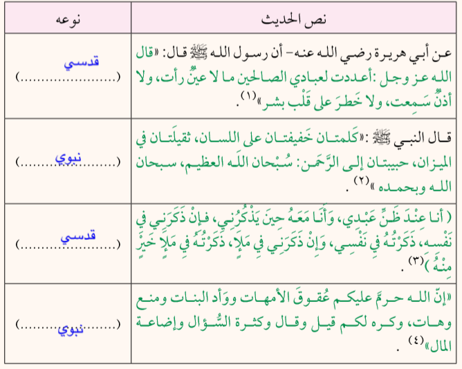 النشاط : سجل نوع الحديث ( قدسي - نبوي ) أمام كل حديث مما يأتي: