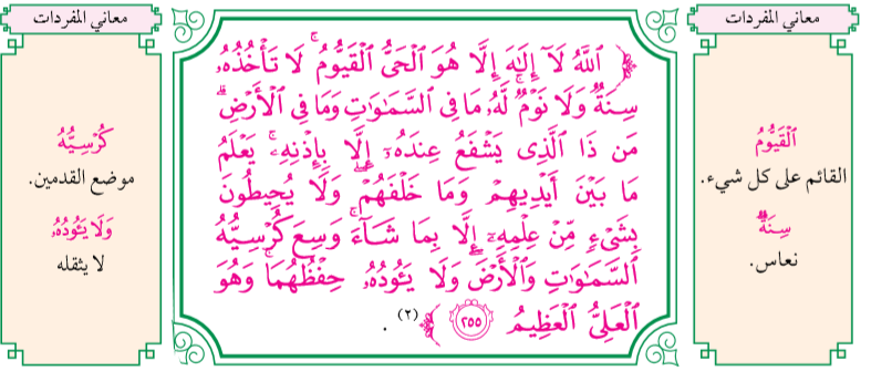 اللَّهُ لَا إله إِلَّا هُوَ الْحَيُّ الْقَيُّومُ……. لَا تَأْخُذُهُ سِنَةٌ وَلَا نَوْمٌ ۚ لَّهُ ……. مَا فِي السَّمَاوَاتِ وَمَا فِي الْأَرْضِ ۗ مَن……. ذَا الَّذِي يَشْفَعُ عِندَهُ……. إِلَّا بِإِذْنِهِ ۚ يَعْلَمُ مَا بَيْنَ أَيْدِيهِمْ وَمَا خَلْفَهُمْ ۖ وَلَا يُحِيطُونَ بِشَيْءٍ مِّنْ عِلْمِهِ إِلَّا بِمَا شَاءَ ۚ وَسِعَ كُرْسِيُّهُ السَّمَاوَاتِ وَالْأَرْضَ……. وَلَا يَئُودُهُ حِفْظُهُمَا ……. وَهُوَ الْعَلِيُّ الْعَظِيمُ