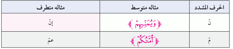 مثال : ثُمَّ - أَصْلَها : ثممَ - (م ساكنة - م متحركة ) أُدْغِمَنا فصارت ثُمَّ، والميم والنون المشدَّدَتَانِ: قد تكونان متوسطتين أو متطرفتين ، وقد تكونان في اسم أو فعل أو حَرْفٍ .