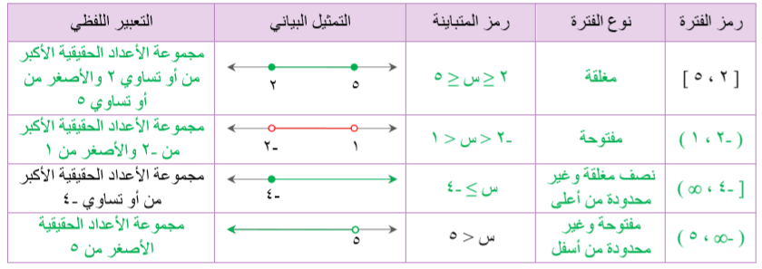 1. اكتب الفترة التي تعبر عن مجموعة الأعداد الحقيقية الأكبر من أو تساوي ٢ والأصغر من ٥.