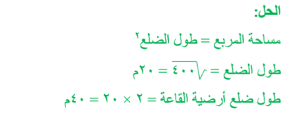 في أحد المعارض ، يوجد قاعة عرض ، لها أرضية مربعة الشكل مقسمة إلى أربعة أجزاء متطابقة . إذا كانت مساحة الجزء الواحد من الأرضية تساوي ٤٠٠ م ، فما طول ضلع أرضية القاعة ؟