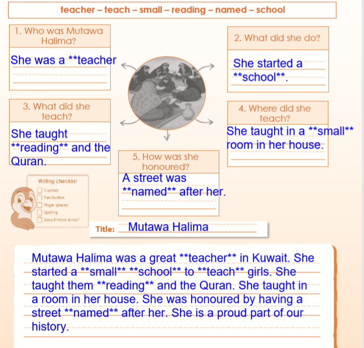 Fill in the graphic organiser then use it to write a paragraph about ‘Mutawa Halima’. The following guide words may help you