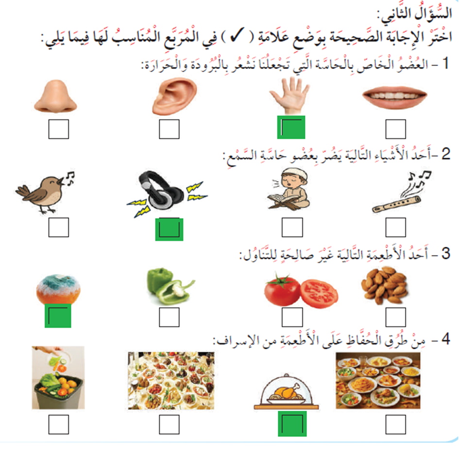 السؤال الأول: ضع علامة(✓) أمام العبارة الصحيحة وعلامة () أمام العبارة غير الصحيحة فيما يلي: