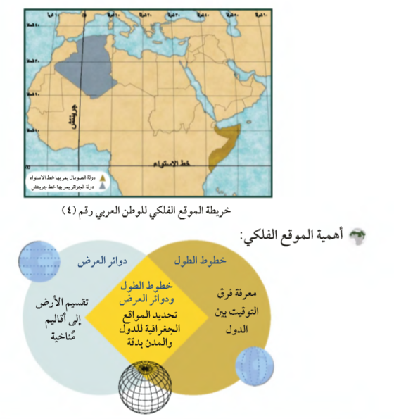 يمتد الوطن العربي فلكيًا بين دائرتي عرض ( 2° جنوبا و ٣٧,٥° شمال خط الاستواء) مروراً بالصومال وخطي طول ( 60° شرقا و 17° غرب خط جرينتش) مروراً بالجزائر باستثناء جزر القمر التي تقع في المحيط الهندي. (لاحظ الخريطة رقم 4).