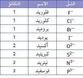 يُشتقّ اسم الأيون السالب (الأنيون) المكوَّن من ذرّة واحدة، من اسم العنصر مضافًا إليه اللاحقة (يد)