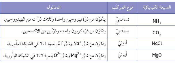 في هذه الجُزَيئات التساهمية، تعبّر الصيغة الكيميائية عن عدد الذرّات الحقيقي في كلّ جزيء. أمّا في المركَّبات الأيونية، فلا توجد جزيئات منفصلة، بل تتكوّن المادّة من شبكة بلّورية منتظمة من الأيونات. لذا،