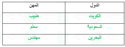 ( الْكُوَيْتُ - طبيب - السعودية - مُعَلِّمُ - الْبَحْرَيْنِ - مُهَنْدِسٌ )