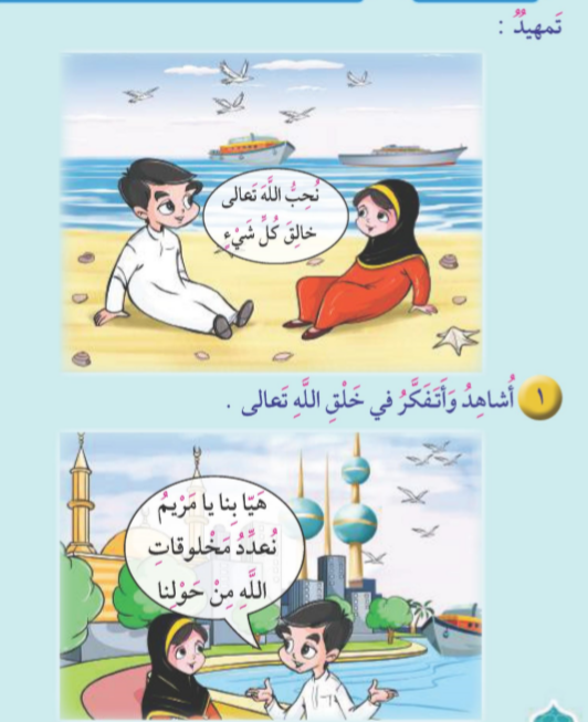 أ- أَخْرُجُ مَعَ إِخْوانِي بِرِفْقَةِ المُعَلِّم إِلَى خَارِجِ الفَصْلِ لِنَتَفَكَّرَ وَنتَأَمَّلَ فِي مَخْلُوقاتِ اللَّهِ - تَعَالَى - وَأَعَبِّرُ شَفَهِيَّا عَنْ جَمَالِ خَلْقِ اللَّهِ - تَعالى - أَمامَ زُمَلائِي .