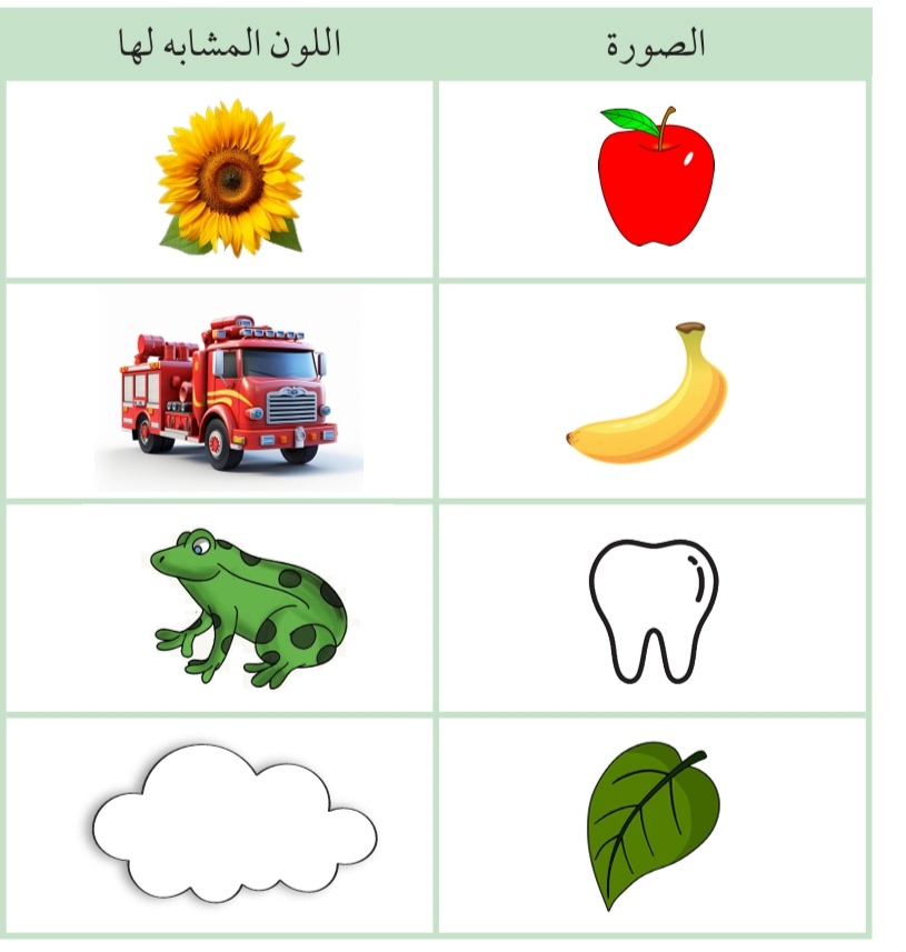 - أَصِلُ بَيْنَ الصّورَةِ واللَّوْنِ المُشابِهِ لَهَا :