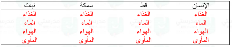 - تحتاج الكائنات الحية إلى الغذاء والماء والهواء والمأوى لكي تعيش وتبقى.