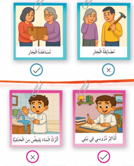 أَضَعْ عَلَامَة ( صح ) أَسْفَلِ الصُّورَةِ الَّتِي تُمَثَلُ السُّلُوك الصَّحِيحَ مَعَ الْجِيرَانِ وفِي البَيتْ وَعَلَامَة ( × ) أَمَامَ السُّلُوكِ الْخَاطِئ :